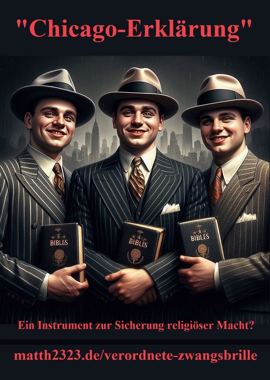 Wenig bekannt, aber wahr: die Chicago-Erklärung verstößt in wichtigen Punkten gegen fundamentale Grundsätze der heiligen Schrift. Obwohl nicht mehr als ein theologisches Konstrukt, obwohl in vielerlei Hinsicht leicht widerlegbar, beansprucht sie für sich den gleichen Rang wie ein von Gott selbst gesprochenes Wort: den Rang einer göttlichen, absoluten, unantastbaren Autorität. Kann der „Chicago-Götze “ auf seinem Sockel stehen bleiben, wenn wir der Versuchung gedankenloser Anpassung das Bibelwort entgegenhalten: „Anderseits steht auch geschrieben….“ (Lk 4,4)? https://matth2323.de/sollte-gott-gesagt-haben