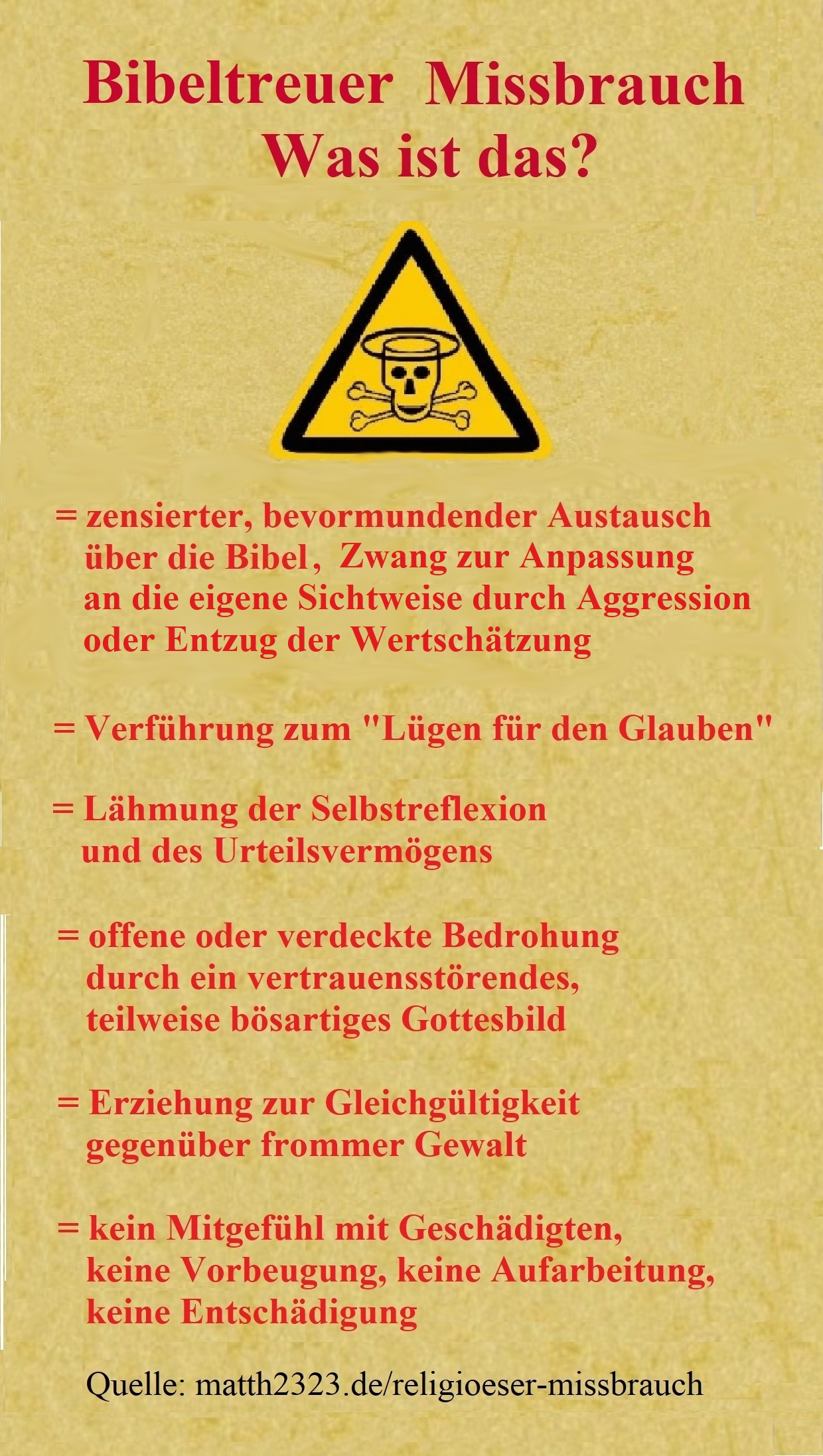Bibeltreuer Missbrauch wird sehr oft nicht als solcher erkannt. Frühes Erkennen ist aber wichtig, da dieser Missbrauch Wertesystem und Persönlichkeit unmerklich in negativer Weise verformt. Glaubensfreude und Heilsgewissheit, Charakterbildung und Liebesfähigkeit können erheblich Schaden nehmen. https://matth2323.de/religioeser-missbrauch