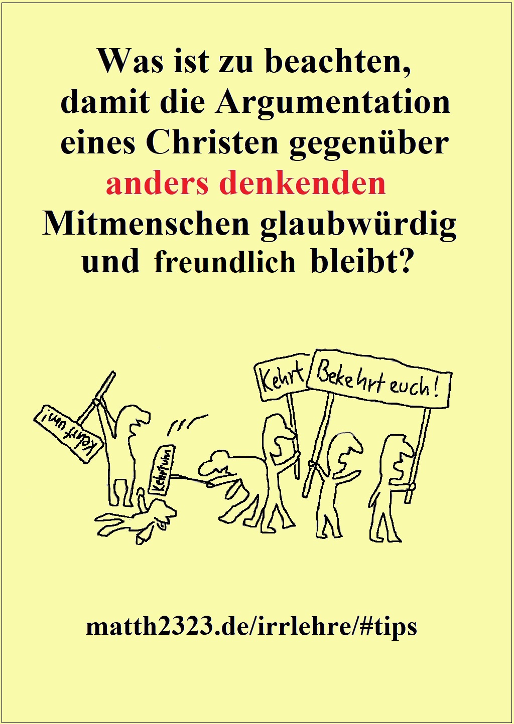 Macht es wirklich Sinn, Gläubige zu theologischen Propagandisten zu schulen mit dem Ziel möglichst vieler Anwerbungen für die christliche Weltanschauung, wenn die Dogmatik auf einfachste Fragen keine überzeugende Antwort geben kann? Kann sich der Gläubige die Aufgabe ersparen, über die Schwachstellen der eigenen Auffassung nachzudenken und Auswege zu diskutieren, die andere Christen im Interesse der Glaubensfreude vorgeschlagen haben. https://matth2323.de/eine-nachricht