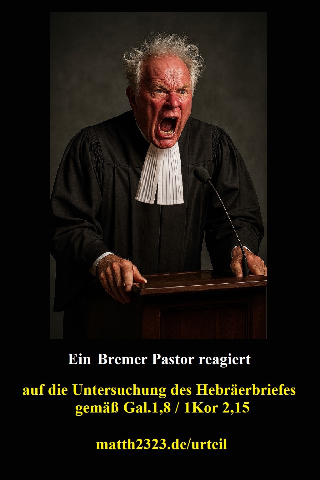 Ein Bremer Pastor (pars pro toto?) reagiert auf eine Untersuchung des Hebräerbriefes gemäß Gal. 1,8 / 1Kor 2,15 – mit Aggression, Ignoranz und viel Sendungsbewusstsein entsprechend dem wegweisenden Vorbild der Satire Ephraim Kishons: „Wie man einen Text beurteilt, ohne ihn zu lesen.“