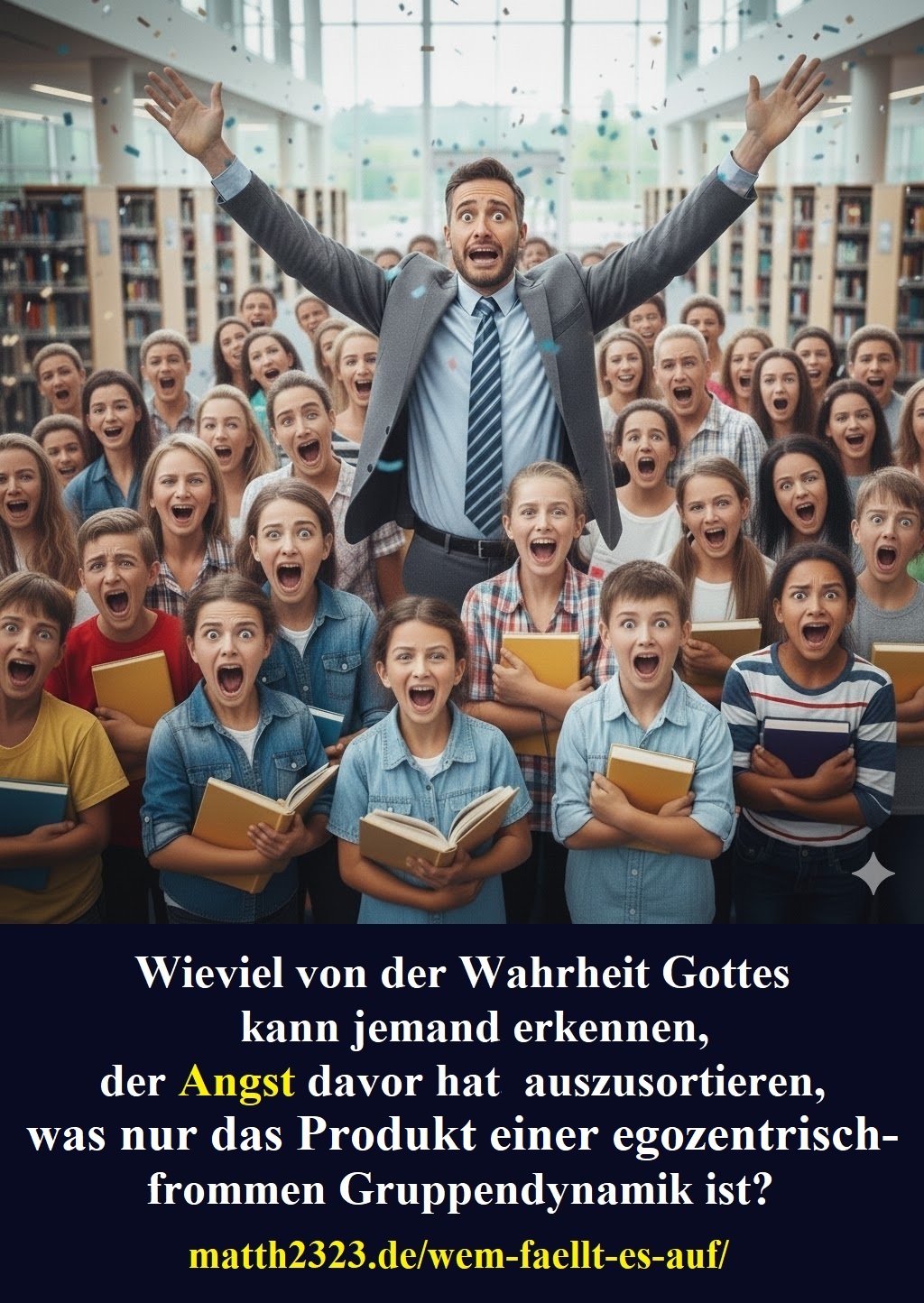 Wieviel von der Wahrheit Gottes kann jemand erkennen, der Angst davor hat, auszusortieren, was nur das Produkt einer egozentrisch-frommen Gruppendynamik ist? Ist nachgeplapperte Dogmatik wirklich eine Bewährung im Glauben? Wohl kaum, auch wenn sie sehr häufig damit verwechselt werden wird. Wer Angst vor Informationen und vor dem ehrlichen Austausch hat, ist blind. Oder nicht? Wer Angst hat, wird aggressiv und muss seinen Scheinglauben mit Abschottung und mit Selbstbetrug retten. Kann jemand, der Angst vor Informationen hat, die Würde des Andersdenkenden und sein Recht auf ehrliche Antworten respektieren? Wohl kaum! Indes kann er sich der Wertschätzung aller nachplappernden Gläubigen sicher sein. Doch kann man auf diese Weise tatsächlich zu ehrlicher Rechenschaft, zu tiefgegründeter Überzeugung, zur Glaubensfreude und zur einer Glaubensgewissheit gelangen, die von frommer Menschenmeinung unabhängig ist?