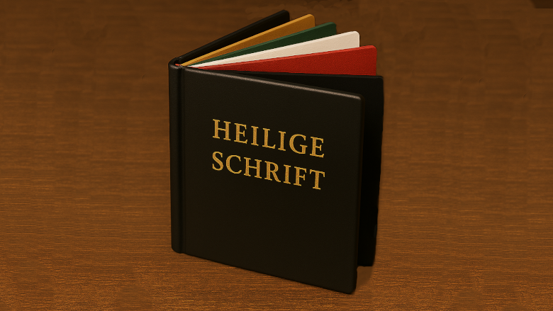 Die grüne Farbe: Als “Vorschuss” der Erlösung hat jeder Gläubige das Geschenk des Heiligen Geistes bekommen (Eph 1,14). Dieser schenkt geistliches Wachstum (Eph 4,14-15), d.h. die Sehnsucht und auch zunehmend die Fähigkeit, Gottes Führung ganz zu vertrauen und nach seinem Willen zu fragen. Durch Treue in den geistlichen Übungen lernt der Gläubige immer mehr, ähnlich wie sein Meister zu fühlen, zu denken und zu handeln (Rö 8,29). Ausbleibendes geistliches Wachstum oder gar Rückschritt ist ein Warnsignal (Hebr 12,14), dass der Gläubige sich auf einen falschen Weg begeben hat.