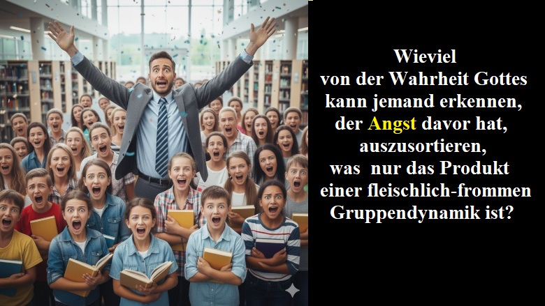 Wie oft, ja eigentlich fast immer, wird auf ehrliche und berechtigte Fragen und auf den Wunsch nach Überprüfung des erlernten Schriftverständnisses mit andressierter Panik, Empörung und sofortigem Abbruch des Kontaktes reagiert („Einüben der Verlustangst„). Denn man ist ja wieder und wieder belehrt worden, dass man mit dieser gedankenlosen Abstoßungsreaktion ein Verdienst vor Gott erwerben würde, dass man sich mit der billigen Zustimmung zu „allem, was die Glaubensgemeinschaft vorgegeben hat“, als besonders „glaubenstreu“ bewähren würde – ohne zu bemerken, dass dieselbe allergische Reaktion fernab jeglicher Selbstprüfung das Typische aller nach Macht und Einfluss strebenden Glaubensgemeinschaften ist.