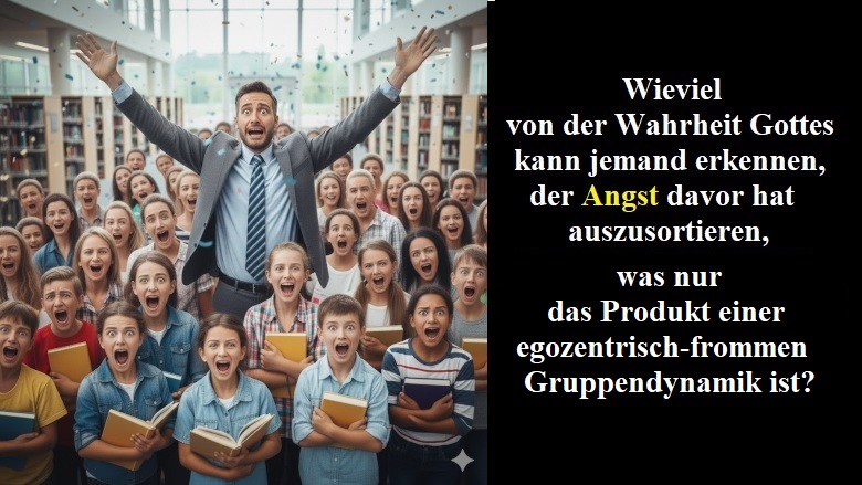 Wie oft, ja eigentlich fast immer, wird auf berechtigte Fragen und auf den Wunsch nach Überprüfung der gutgläubig übernommenen „Bibelbrille“ mit angelerntem Entsetzen, Empörung und sofortigem Abbruch des Kontaktes reagiert („Einüben der Verlustangst“). Denn man ist ja wieder und wieder belehrt worden, dass man mit dieser gedankenlosen Abstoßungsreaktion ein Verdienst vor Gott erwerben würde. So hat man die Überzeugung erworben, dass man sich mit der billigen Zustimmung zu „allem, was die Glaubensgemeinschaft vorgegeben hat“, als besonders „glaubenstreu“ bewähren würde – ohne zu bemerken, dass dieselbe allergische Reaktion fernab jeglicher Selbstprüfung das Typische aller nach Macht und Einfluss strebenden Glaubensgemeinschaften ist.